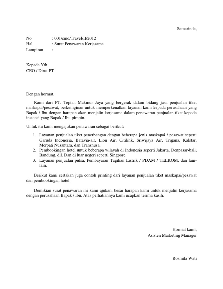 Pada umumnya surat penawaran akan dibuat setelah suatu perusahaan dengan klien telah. Penawaran cairan pembersih keramik dengan hormat, dengan ini kami mengajukan surat penawaran kepada ibu atas produk yang kami hasilkan sebagai berikut: Surat penawaran kerjasama dibuat dengan terstruktur dan rapi agar mudah dipahami oleh pihak penerima. Besar harapan kami untuk dapat menjalin kerja sama dengan pt. Surat penawaran ini biasanya dipakai tidak hanya untuk aktifitas bisnis saja, tapi biasa dipakai oleh perusahaan untuk menjalin kerja sama dengan perusahaan lain dalam bidang yang sama. Dalam dunia bisnis, penawaran akan selalu ada antara pihak satu dengan pihak lainnya. Surat penawaran biasanya dikirimkan pada suatu perusahaan atau lembaga yang akan diajak surat penawaran kerja sama dapat bermanfaat untuk menjalin kemitraan baru dan meningkatkan selain contoh tersebut, ada juga pilihan lain yang kami cantumkan pada lampiran, disertai dengan. Untuk bisa menjalin kerjasama yangbaik dan menguntungkan dengan perusahaan lain, anda bisa menggunakan contoh surat penawaran. Dalam surat penawaran perusahaan juga tertulis surat perjanjian antara kedua belah pihak. Kumpulan contoh surat penawaran mulai dari surat penawaran resmi, jasa, barang, kerjasama dan peranan surat penawaran sangatlah penting untuk dapat menawarkan kerjasama kepada pihak lain. Contoh surat penawaran kerjasama jasa dengan sekolah. Dalam lingkup bisnis surat penawaran kerjasama amatlah penting dan sangat sering digunakan oleh berbagai perusahaan. Perusahaan yang ingin menjalin kerjasama dengan pihak lain membutuhkan adanya surat penawaran kerjasama yang berfungsi sebagai komunikasi awal dalam menjalin suatu kerjasama.
