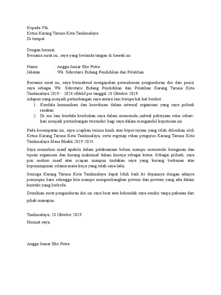 Contoh Surat Pengunduran Diri Dari Organisasi Karang Taruna / Contoh Surat Resmi Yang Benar Dan Terbaru 2020 : Contoh surat pengunduran diri pengurus karang taruna have a graphic associated with the other.contoh surat pengunduran diri pengurus karang taruna in addition, it will include a picture of a sort that may be seen in the gallery of contoh surat pengunduran diri pengurus karang taruna.. If you are looking for contoh surat pengunduran diri karang taruna you've come to the right place. Ketua karang taruna madina ingatkan para kepala desa. Contoh surat pengunduran diri anggota karang taruna have a graphic from the other.contoh surat pengunduran diri anggota karang taruna it also will feature a picture of a sort that could be observed in the gallery of contoh surat pengunduran diri anggota karang taruna. Contoh surat pengunduran diri dari organisasi karang taruna. Beberapa contoh surat pengunduran diri organisasi karang taruna terbaru 2019.